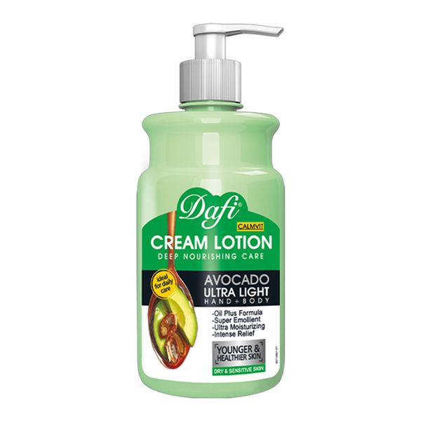 لوسیون و مرطوب کننده دافی مدل آووکادو محصولی مرطوب کننده، ضد خشکی پوست، تقویت کننده پوستهای حساس است. این فرآورده با داشتن ترکیباتی مثل روغن آووکادو، ویتامین C و E، وازلین، هیالورونیک اسید و… از خشکی پوست جلوگیری میکند.